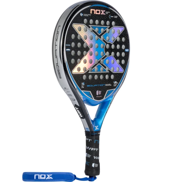 The Nox EQUATION World Padel Tour 2023 version combines manoeuverability, control, and precision with a great feel and a large sweet spot provided by the combination of materials used in professional padel rackets. The EQUATION World Padel Tour 2023 edition is a racket with a medium balance, carbon frame and anti-vibration system to prevent players from injuries. The roughness of its faces achieved by 3D transparent layers will help players to give greater effects to their shots. This padel racket includes the pioneering Smartstrap® replaceable safety cord system, now evolved into a compact piece for greater security and durability.
